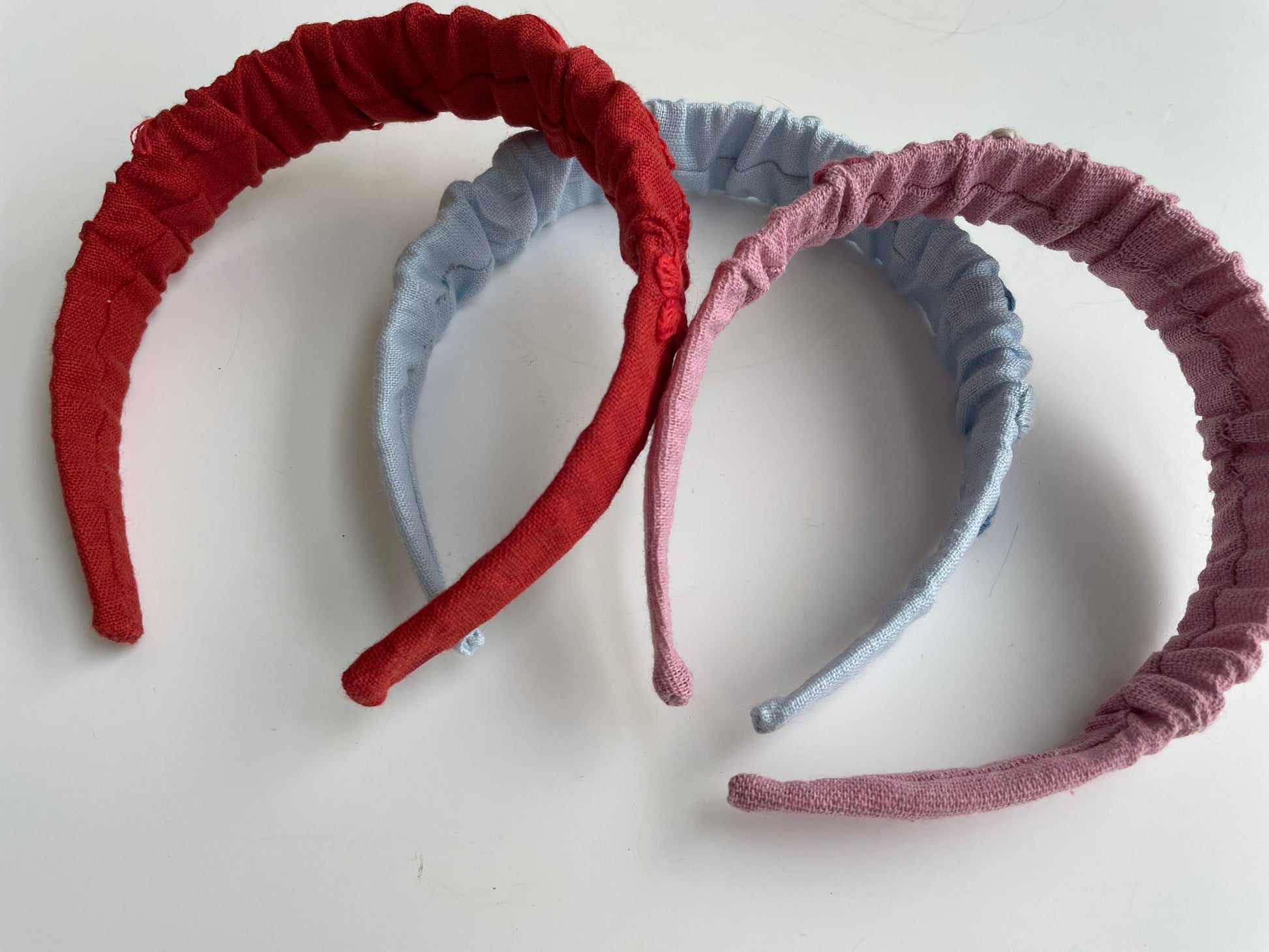 MATERIALS: linen, plastic (headband base), metal (hair tie and clip)