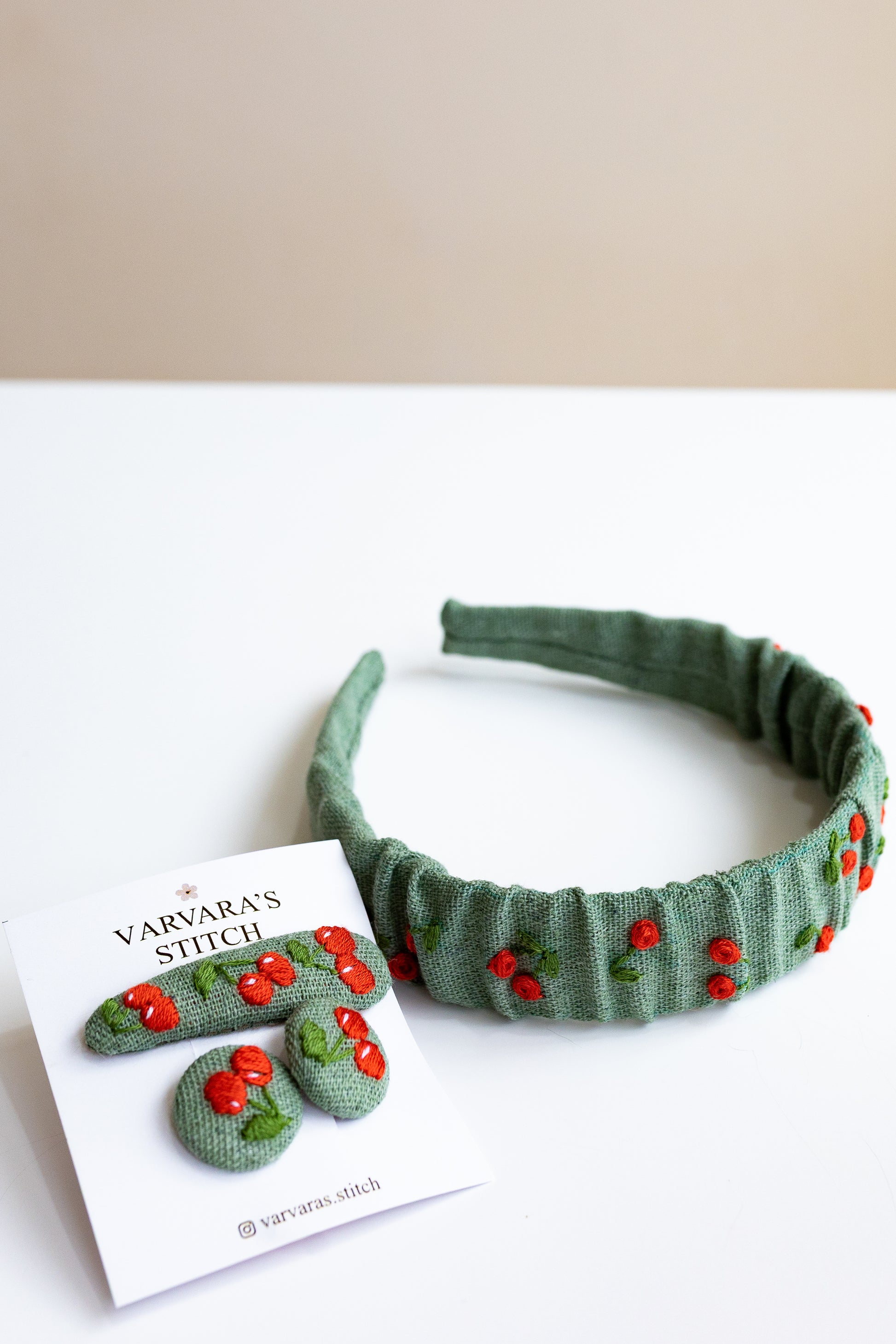 This embroidered cherry green hair accessory set brings a playful and charming touch to everyday looks. The cute red linen headband adds a soft pop of color, while the girly button hair tie offers a sweet detail for tying up hair with ease.