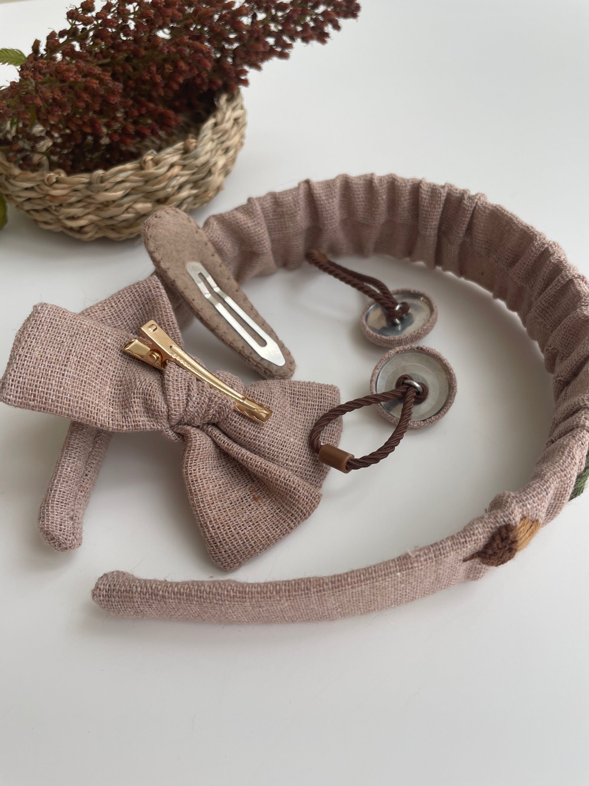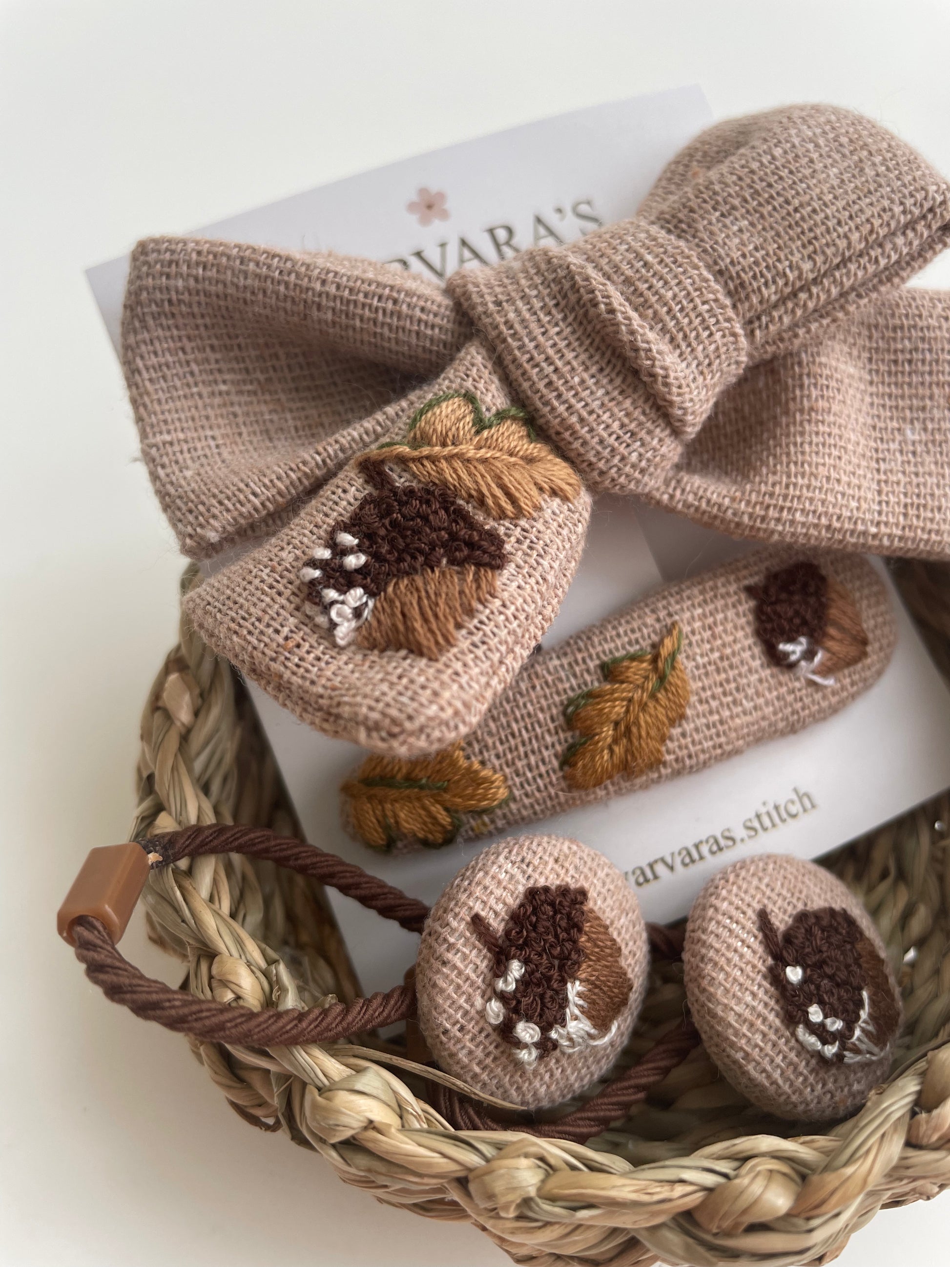 Embroidered Linen Autumn Baby Hair Accessories Set: Acorn Hair Ties, Clip, Bow & Headband ๐ Free Shipping