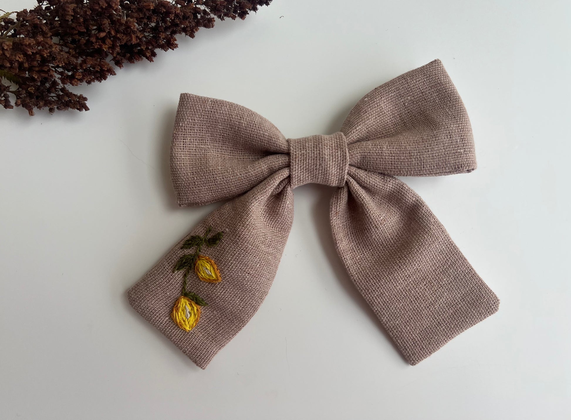 Add a touch of charm to your hairstyle with our hand-embroidered linen hair bows