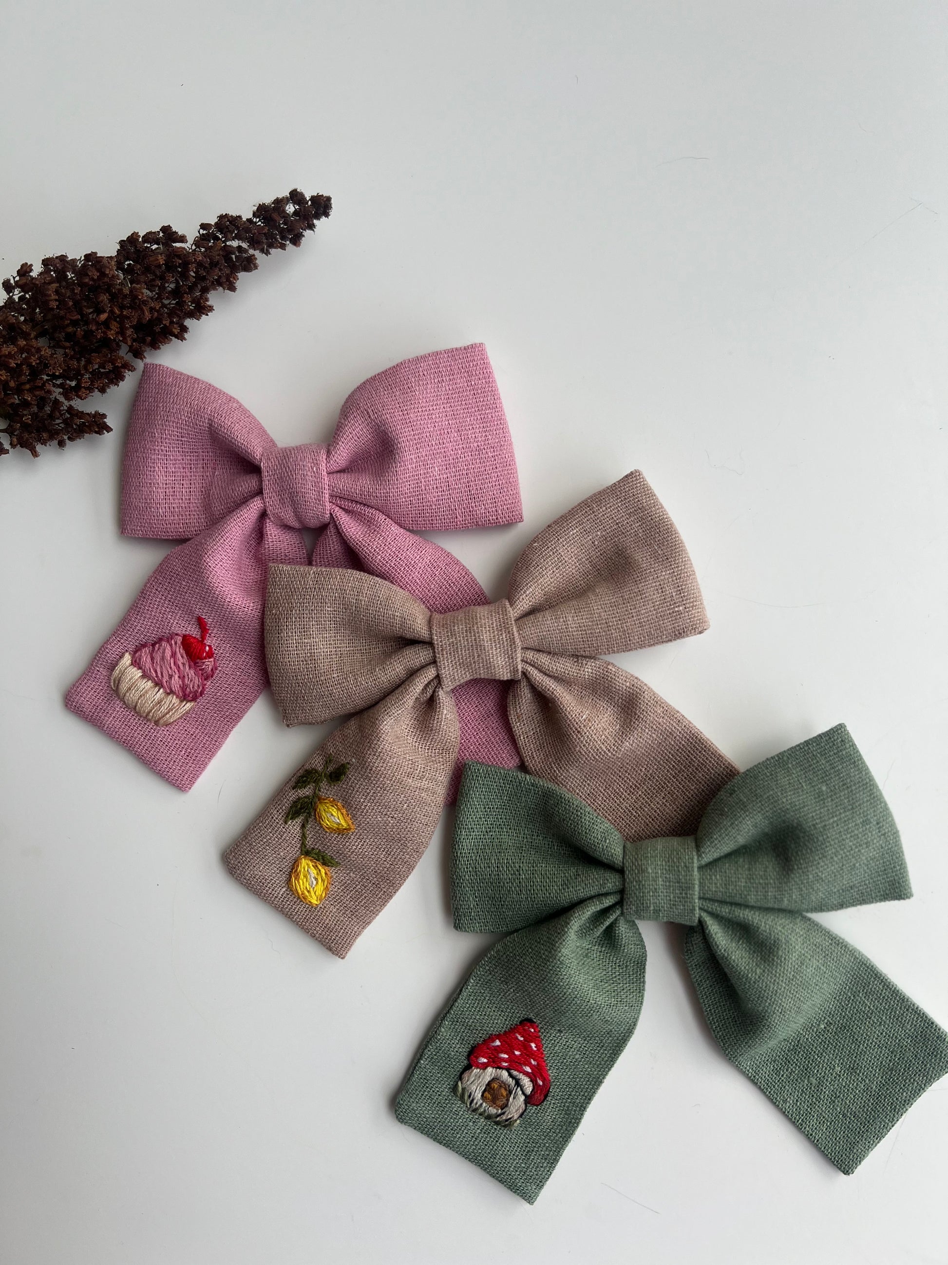 Hand Embroidered Linen Hair Bow - Cupcake, Mushroom, Lemon Designs ๐ Free Shipping