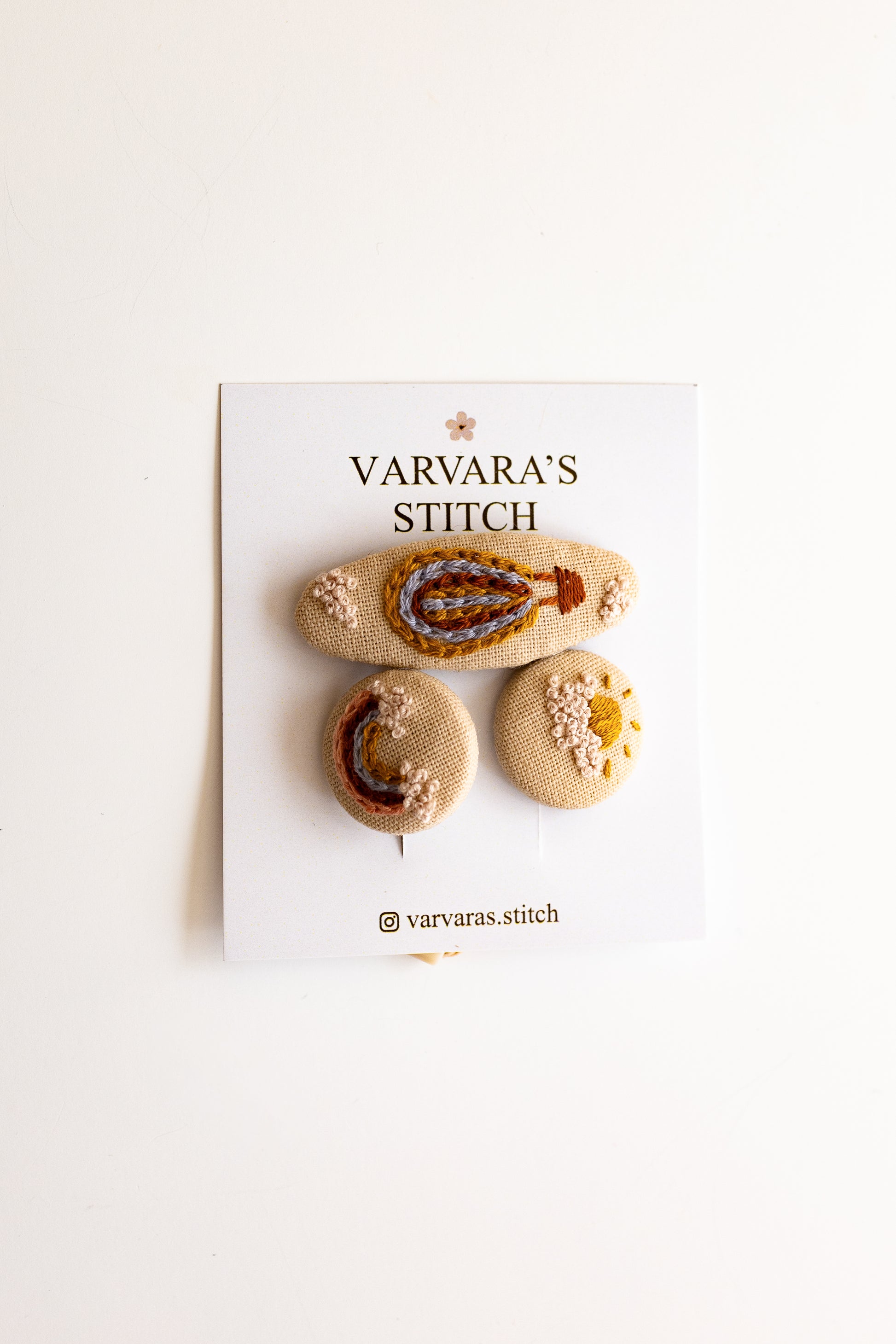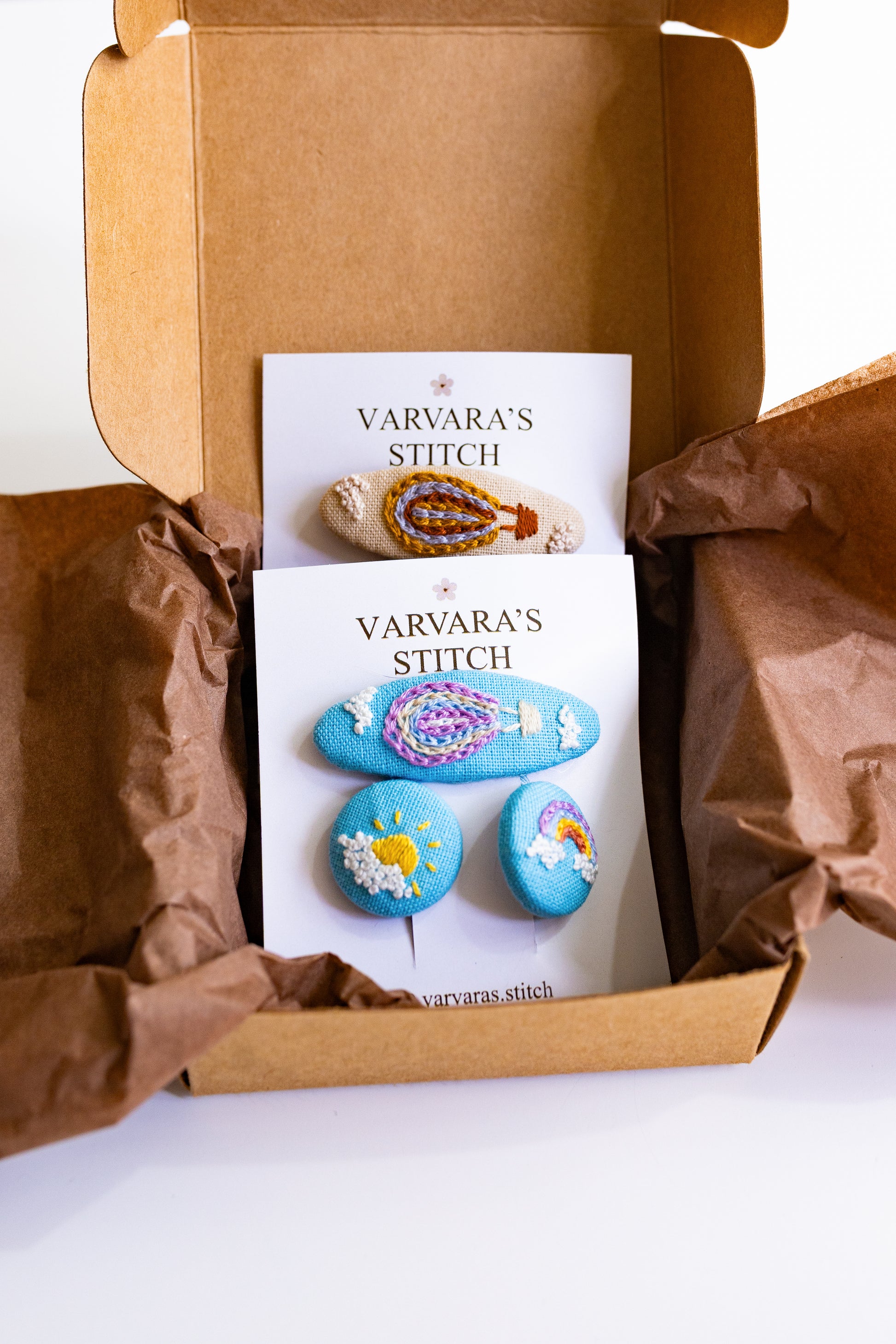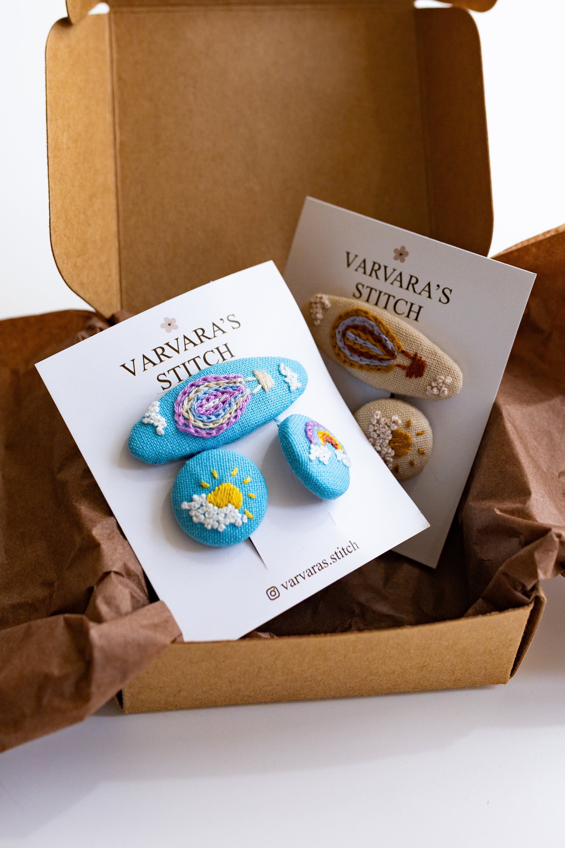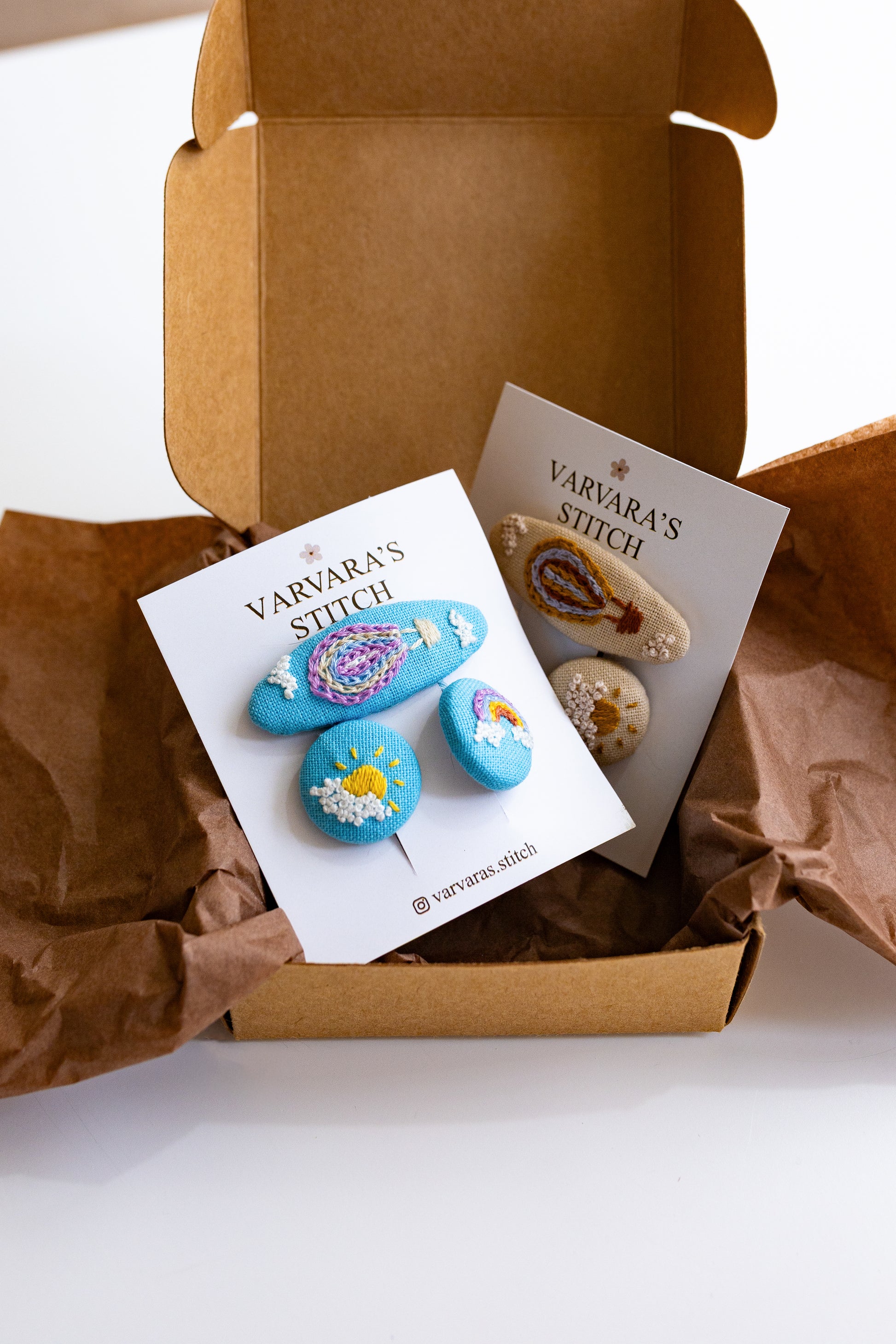 Hand Stitched Kids Hair Accessory Set: Embroidered Linen Balloon Clips π Free Shipping