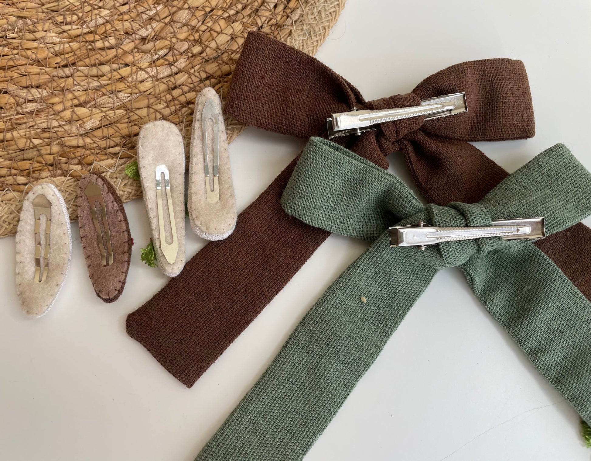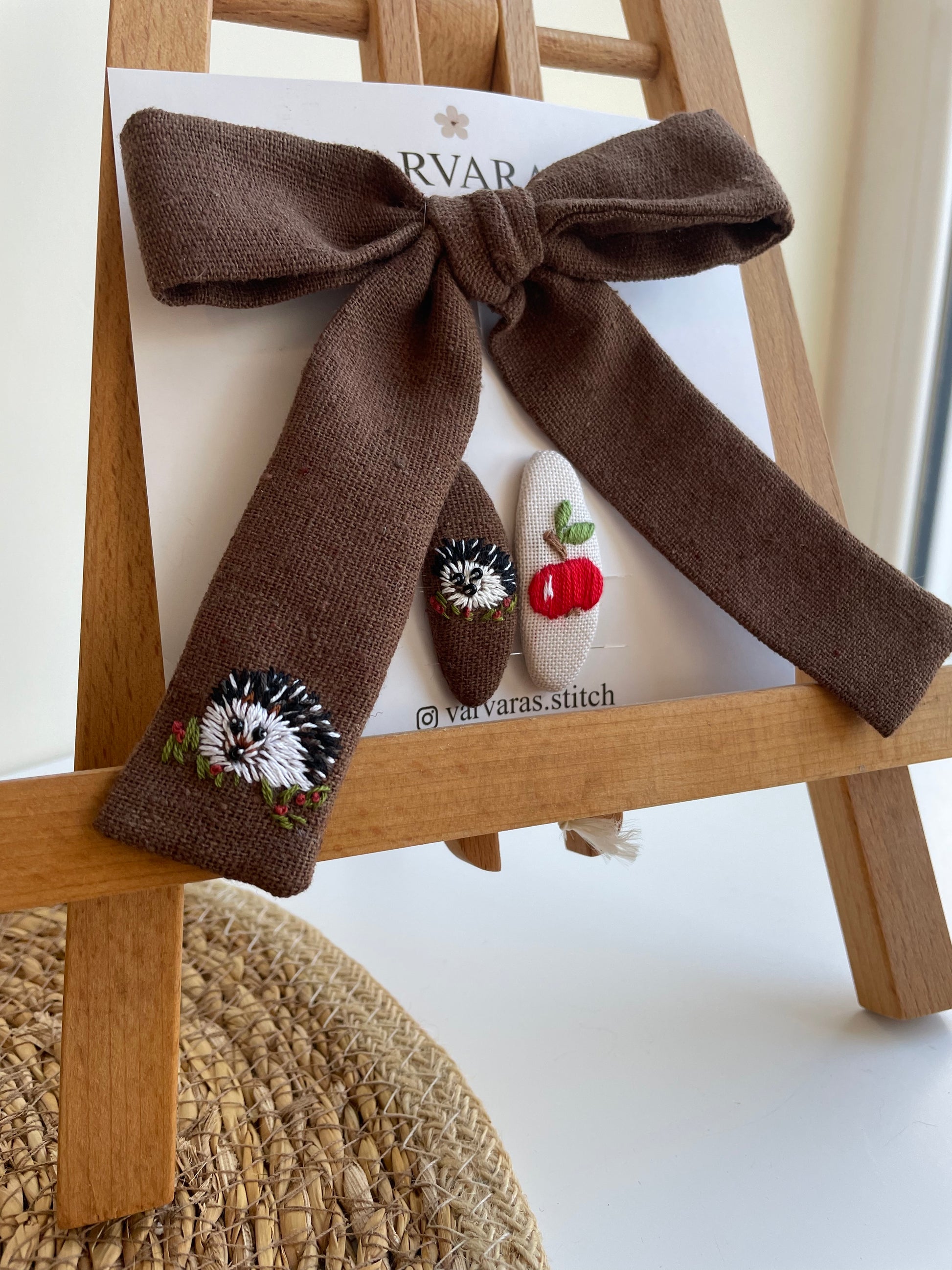 This handmade hair bow set is crafted from natural linen and decorated with delicate hand embroidery inspired by woodland animals.