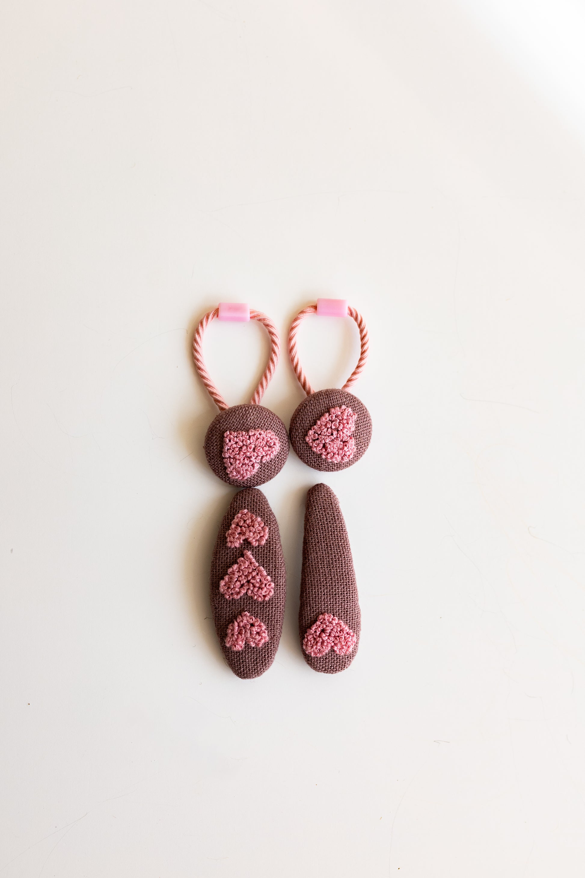 Pink Heart Embroidered Linen Hair Clip & Tie Set: Handmade Toddler Girl Gift π Free Shipping